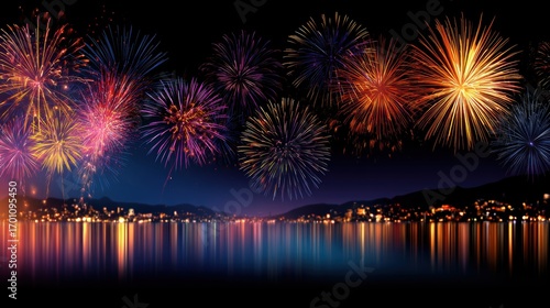 Colorful fireworks illuminate the night sky over a tranquil lake, with city lights reflecting on the water