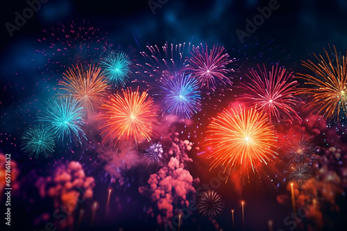 Colorful fireworks on dark sky background for celebration happy new year and merry christmas. Colorful fireworks of various colors over night sky. New Year celebration background