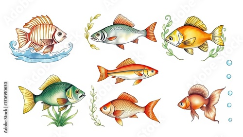 Colorful Fish Illustration Set Aquatic Life Marine Animals Ocean Pond River Tropical Fish Goldfish