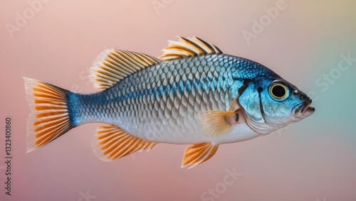 Colorful fish with blue and orange accents swimming against a soft pastel background with gentle gradients of pink and cream for a serene effect.