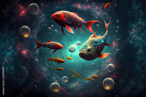 Colorful fishes floating in outer space with planets and stars, created with generative ai