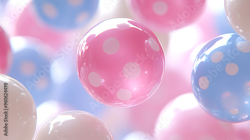Colorful floating balloons in pastel pink, blue, and white shades with polka dots create a playful atmosphere, evoking a festive celebration