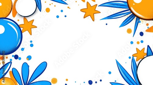 Colorful floral frame, vibrant illustration, blue, orange, white. Decorative border on white