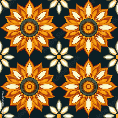 Colorful floral pattern featuring vibrant sunflowers and delicate white flowers on a dark background.