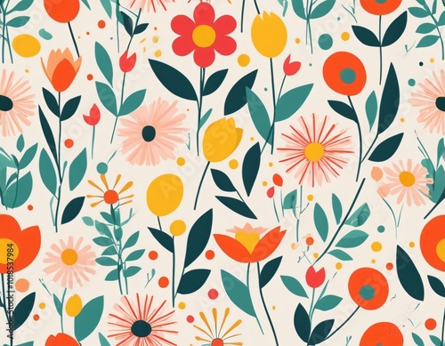 Colorful floral pattern with assorted flowers on a pale background suitable for fabric or wallpaper