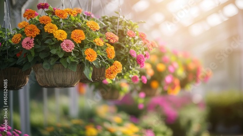 Colorful flower arrangements hanging in a greenhouse.
