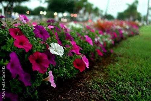 Colorful flower bed featuring petunias along a park walkway on a sunny day