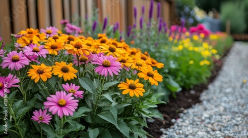 Colorful flower garden blooms with vibrant petals in a well-maintained outdoor space