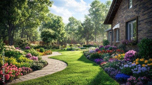 Colorful Flower Garden Path Beside Brick House