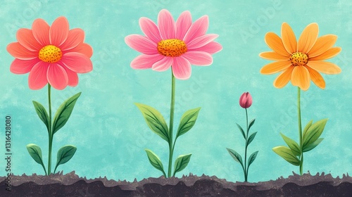 Colorful flower illustrations rising from dark soil in a pleasant way