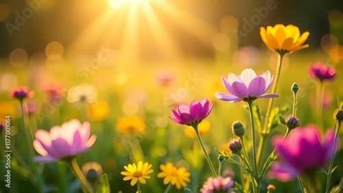 Colorful flower meadow with sun rays and bokeh - nature background banner with copy space - summer greeting card wildflowers spring flowers