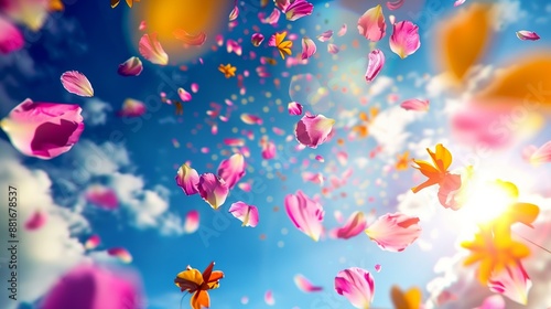 colorful flower petals flying against blue sunny sky bright summer vibes