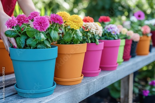 Colorful Flower Pots with Vibrant Flowers in a Garden Setting