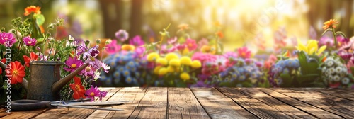Colorful flowers and garden tools arranged neatly on a wooden table with a blurred natural background. Generative AI