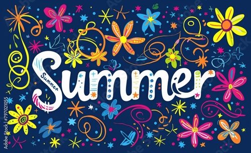 colorful flowers and swirls, stars, the word "Summer" in white on dark blue background Generative AI