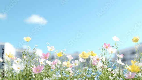 Colorful Flowers in a Cityscape. Bright Blooms in Front of Buildings. Possible Use Nature background, spring design