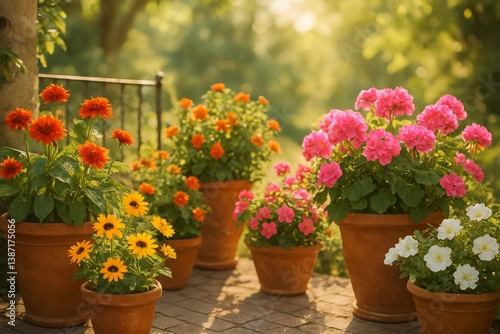 Colorful Flowers in Terracotta Pots Brighten a Serene Garden Path During Golden Hour