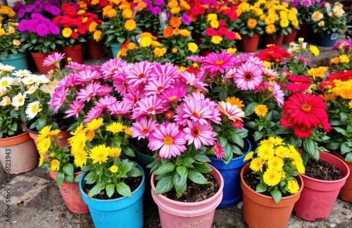 Colorful flowers in various pots. Vibrant blooms in different colors. Arrangement perfect for home decor. Potted flowers ideal for gift decoration. Plants in diverse containers create cheerful