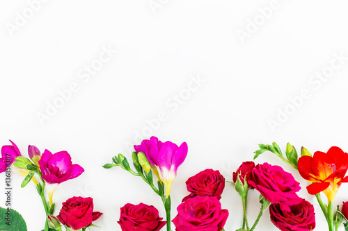 Colorful flowers isolated on white background. Flat lay, Top view. Floral background