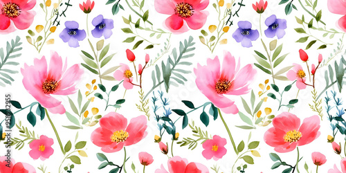 Colorful flowers meadow seamless pattern. Vibrant colors painting style.