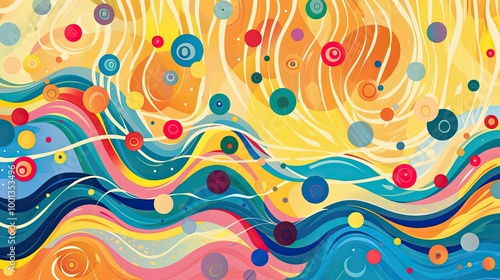 Colorful fluid background with irregular round shapes and curving parallel lines