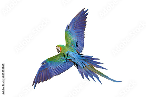 Colorful flying Harlequin Macaw parrot isolated on transparent background png file