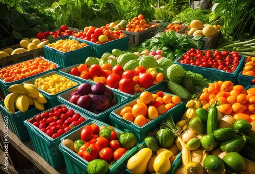 colorful food donation containers overflowing fresh fruits vegetables displaying community generosity abundance, produce, vibrant, healthy, organic, variety