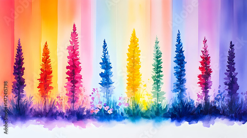 Colorful forest bathed in rainbow light