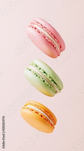 Colorful French Macarons Floating Against Soft Pastel Background : Generative AI