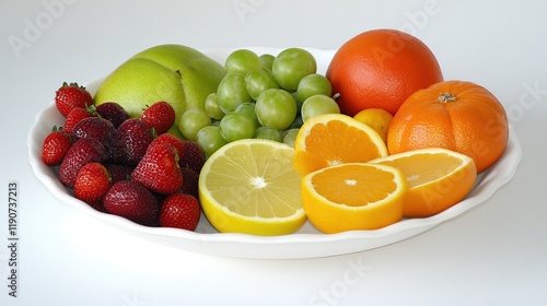 Colorful fresh fruit platter with strawberries, grapes, oranges, grapefruit, and lemon.
