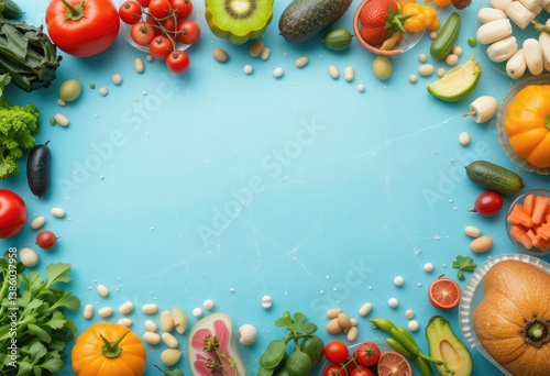 Colorful Fresh Fruits and Vegetables Bordering a Light Blue Surface