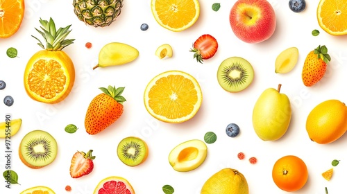 Colorful fresh fruits like oranges, strawberries, kiwis, and apples on white background.