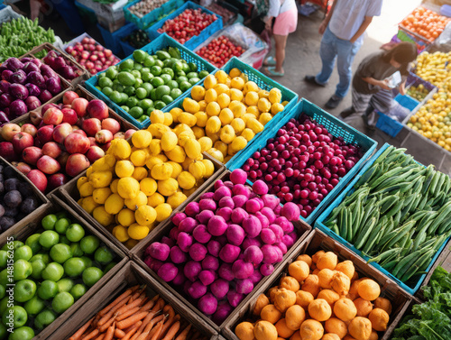 Colorful fresh vegetables and fruits displayed in baskets at lively outdoor market, with people shopping and browsing in background, creating vibrant and busy atmosphere