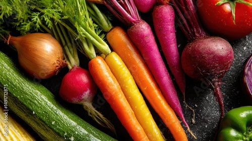 Colorful Fresh Vegetables Close Up Lay Flat Composition on Dark Surface Carrots Beets Radish Onion Zucchini Tomato Pepper