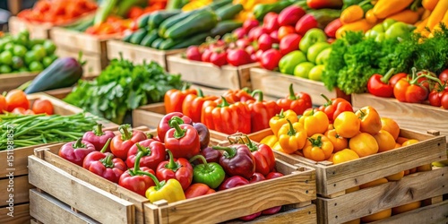 Colorful Fresh Vegetables in Wooden Crates at a Farmer’s Market - Vibrant Produce, Organic Farming, Healthy Eating, Seasonal Harvest, Rustic Aesthetics