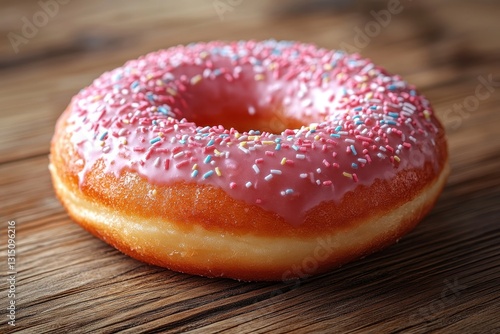 Colorful frosted donut with sprinkles placed on a wooden surface, perfect for dessert lovers at any time of day