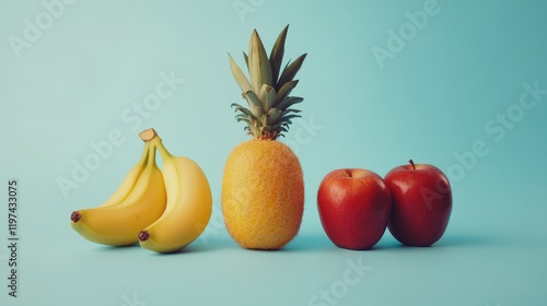 Colorful Fruit Display with Bananas, Pineapple, and Red Apples on Aqua Background