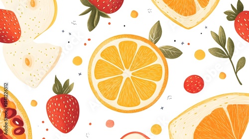 Colorful Fruit Pattern with Strawberries, Lemons, and Oranges