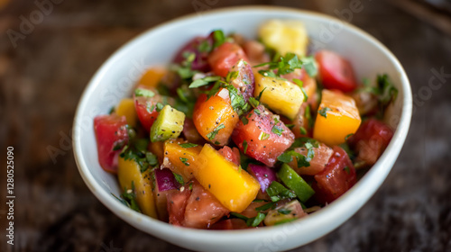 Colorful fruit salad bowl showcasing vibrant ingredients and fresh herbs prepared for a healthy meal