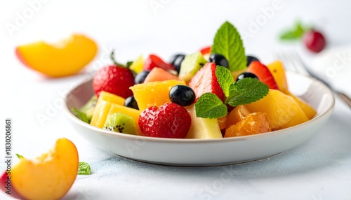 Colorful fruit salad with peaches, berries, kiwi, and mint served on a plate