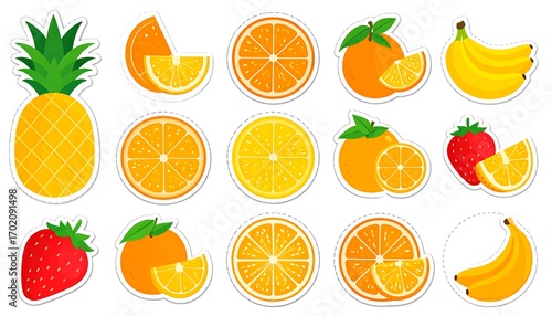 Colorful fruit stickers featuring vibrant pineapple, orange, banana, and strawberry slices.