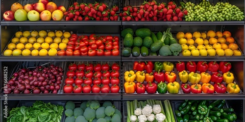 Colorful fruits and vegetables displayed in grocery store produce section. Concept Grocery Store, Produce Section, Colorful Fruits, Colorful Vegetables