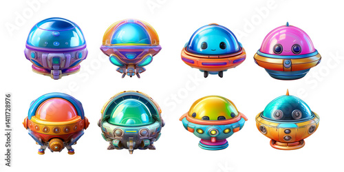 Colorful Futuristic Space Pods with Glossy Finish and Unique Designs, holographic of Iridescent Kawaii 3D, Isolated on Transparent background
