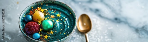 Colorful Galaxy-Themed Smoothie Bowl with Fresh Berries and Edible Decorations on Marble Background