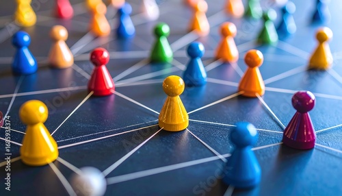 Colorful game pieces are linked by lines, showing a network concept on a dark textured surface