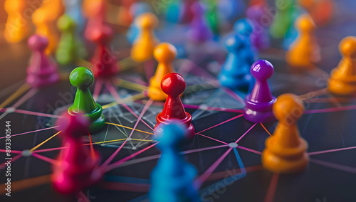 Colorful game pieces interconnected by lines, representing social network, communication, and collaboration on a dark surface.