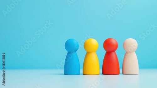 Colorful game pieces stand in a line against a blue background, representing diversity and teamwork in a playful setting.