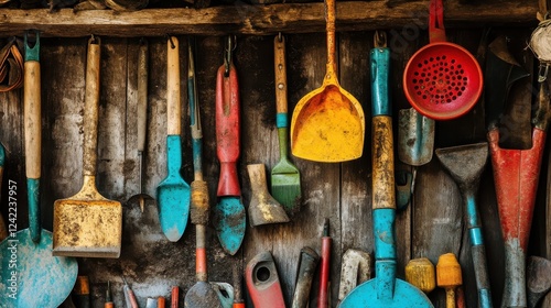 Colorful Garden Tools Hanging on Rustic Wooden Wall
