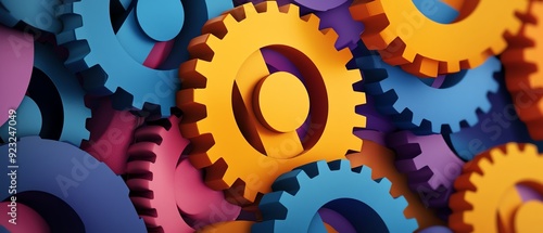 Colorful gears in various shapes and sizes, representing innovation and teamwork in a creative and vibrant workspace.