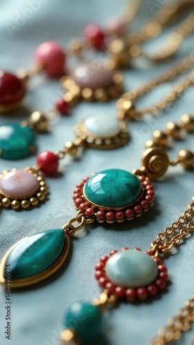 Colorful gemstone necklaces with gold chains and beaded accents display.